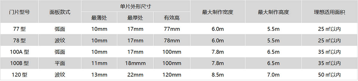 2.5 門體:根據(jù)不同的門洞規(guī)格及開門機選型,配置相應(yīng)的77㎜、80㎜、90㎜、100㎜、120㎜的雙層鋁合金門體,應(yīng)滿足門的不同要求,總體要有足夠剛性和強度;