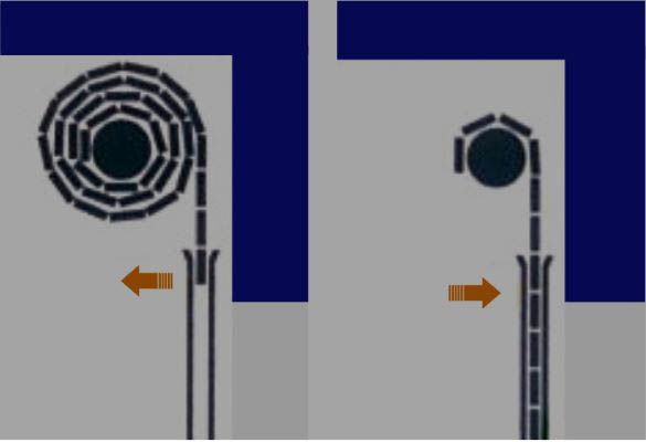 圖A:安裝普通支撐的工業(yè)歐卷門運行過程中與軌道的關(guān)系圖(剖面) | 圖B:安裝華建滾動支撐系統(tǒng)的工業(yè)歐卷門運行過程中與軌道的關(guān)系圖(剖面) |