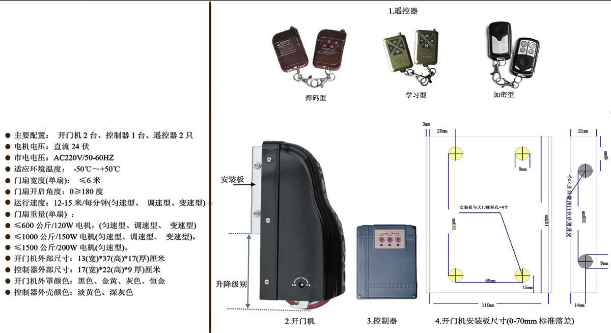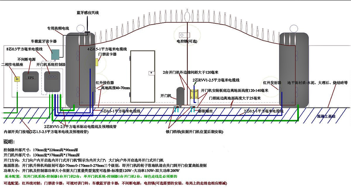 華建電動庭院門材質分為:鋼質(鐵藝)庭院門、鋁藝庭院門、木庭院門按開啟方式分為:電動平開庭院門電動平移庭院門,電動平開門又分內開門和外開門,電動平開庭院門不管門體采用任何材質,整體的運行方式是一樣的(扇形運行)但開門機多種多樣有:地滾平開門機、直臂懸臂開門機、曲臂開門機地埋開門機;這么多開門機種類但電動平開庭院門還是安裝地滾平開門機的綜合效果最佳性價比最好;這里按地滾平開門機的電動平開庭院門做技術說明。