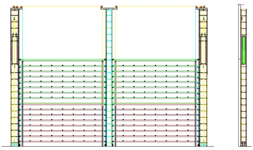 由兩段兩層或多段多層門扇組成門體,門體在兩側桁架的軌道中垂直運行,其中一側桁架作為門體導向及配重架導向引導配重裝置穩定運行,連接著頂部單元和導向單元將門體的大部分自重及負荷傳遞在地面。另外一側桁架穩定門體及支持導向主架及頂部滑輪系統。采用配重平衡,在門體一側設有配重導向支架,軌道安裝支架及頂部滑輪系統,在另一側設有軌道安裝支架,及頂部滑輪系統。門扇通過鋼絲繩及滑輪系統與配重架連接,在配重架內安放合適重量的配重量以平衡門體重量,驅動電機通過鏈條鏈輪及鋼絲繩等傳動裝置,驅動配重架作上下運動,從而帶動門扇作上、下運動;